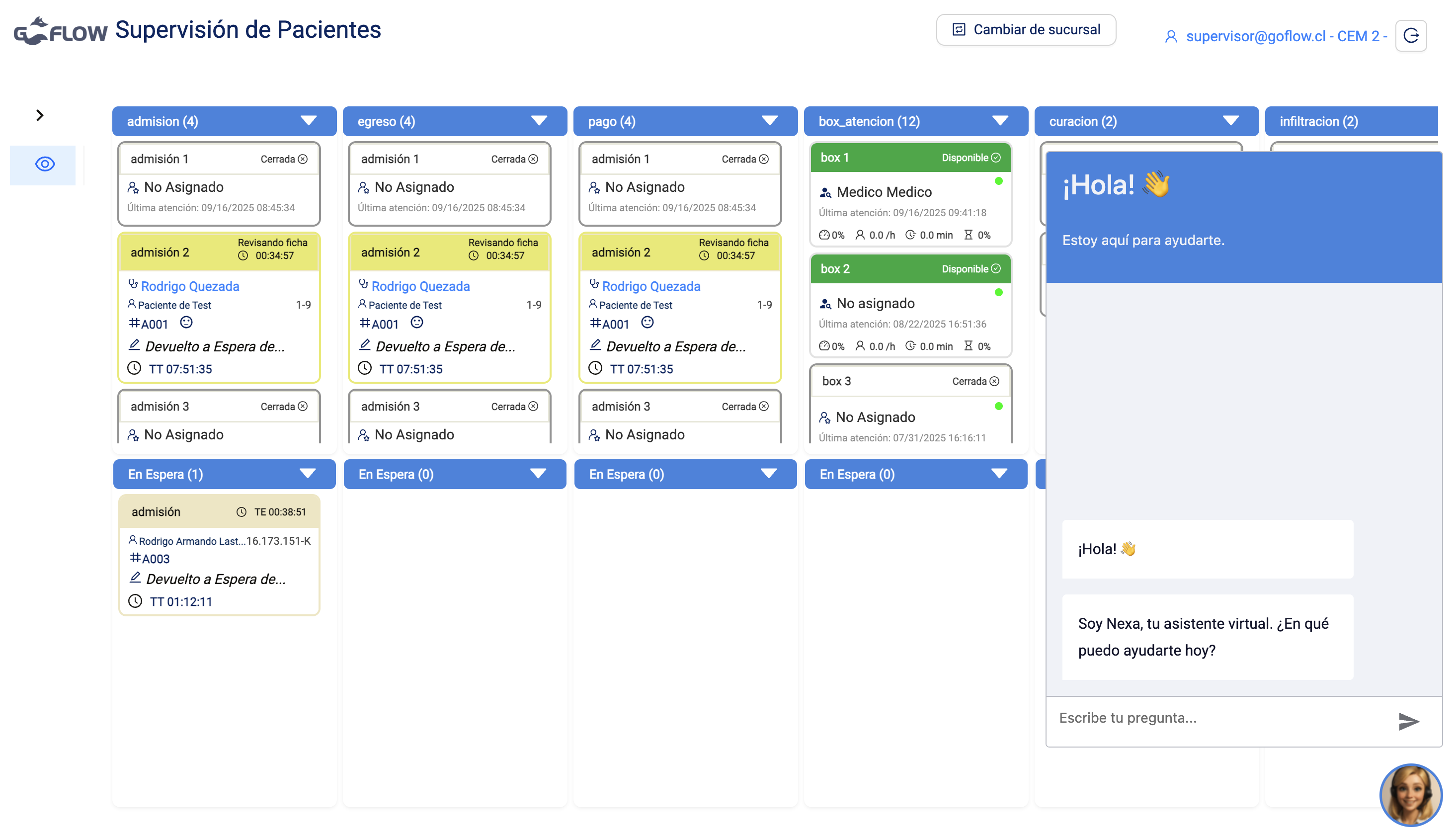 GoFlow orquesta el Viaje del Cliente/Paciente de punta a punta. Predice, decide y comunica en tiempo real para eliminar esperas y aumentar productividad. Soporta urgencia, toma de muestras, pabellón y hospitalización con reglas y simulación en vivo.